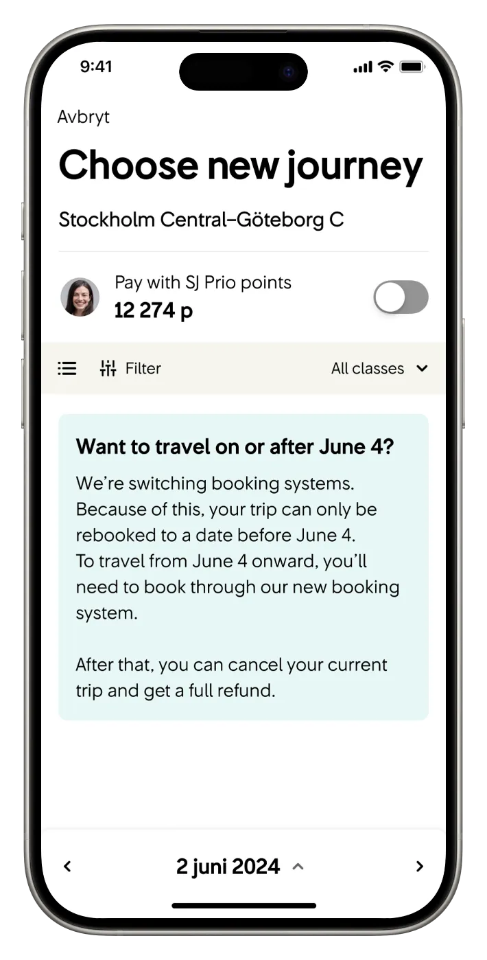 SJ was replacing their entire booking backbone while keeping millions of monthly bookings flowing. For months, we'd run two systems in parallel - old trips in the legacy system, new trips in the updated one. Users booking travel could land in either system depending on their dates, and we needed to make this technical nightmare feel intentional and clear.